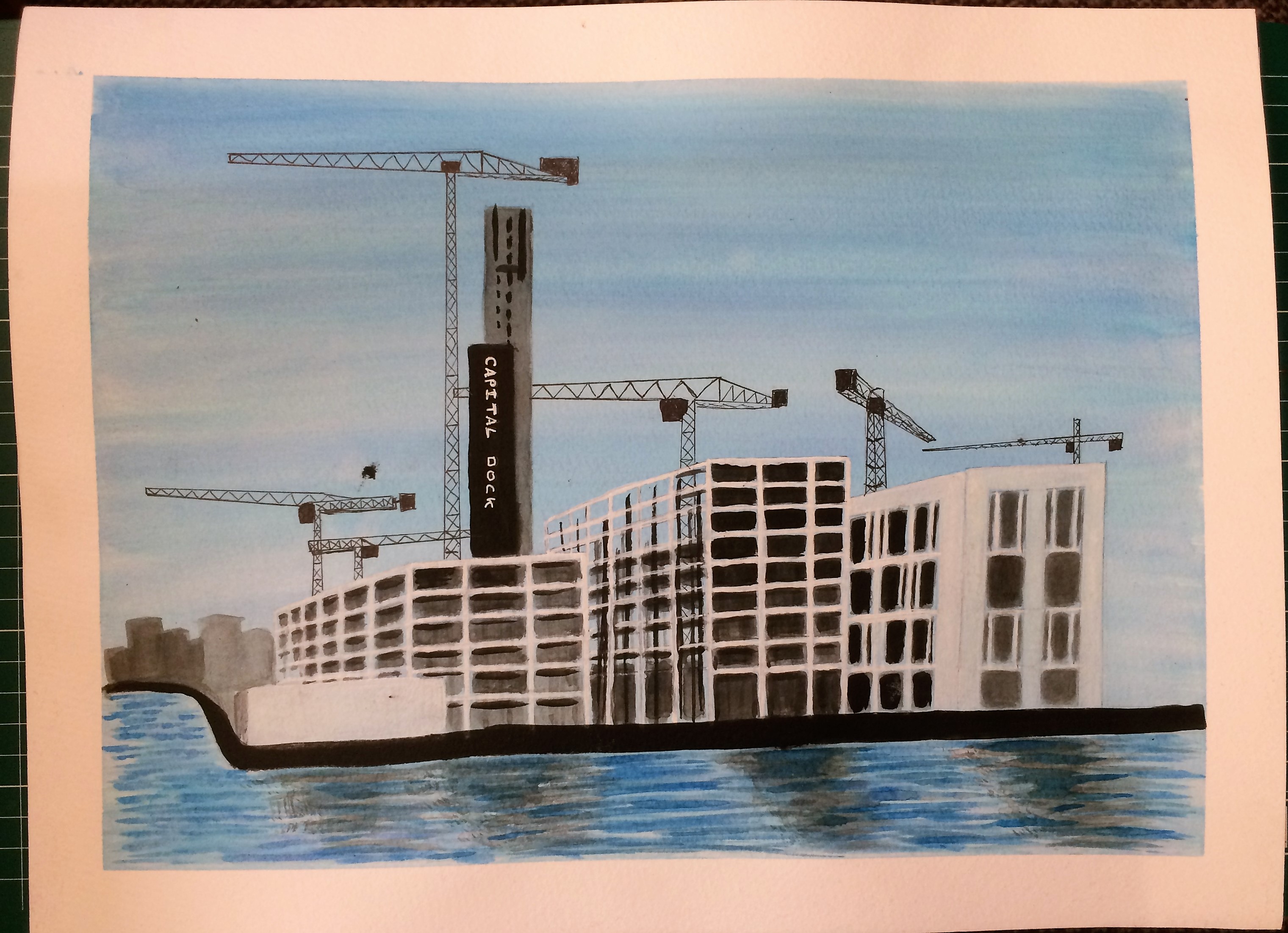 Going up the quays in Dublin recently I was struck by the number of cranes towering above the city’s buildings. I counted about 20 cranes between O’Connell street and the point O3. This painting is from a photo I took of a new dock in development, Capital Dock. I did this one with inks on watercolour paper.